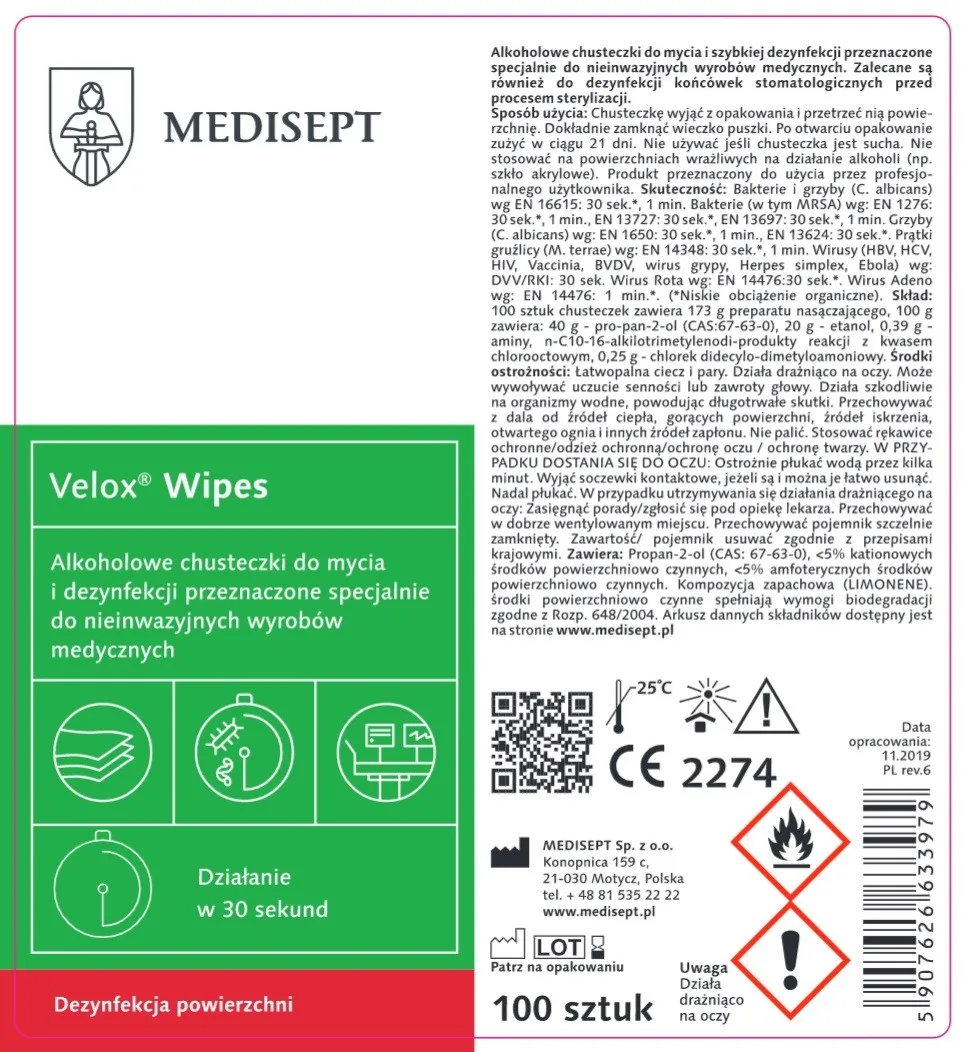 MEDISEPT Velox Wipes to gotowe do użycia chusteczki nasączone preparatem na bazie alkoholu, przeznaczone do mycia i szybkiej dezynfekcji powierzchni oraz nieinwazyjnych wyrobów medycznych. Skutecznie usuwają bakterie, grzyby, prątki gruźlicy i wirusy w zaledwie 30 sekund.