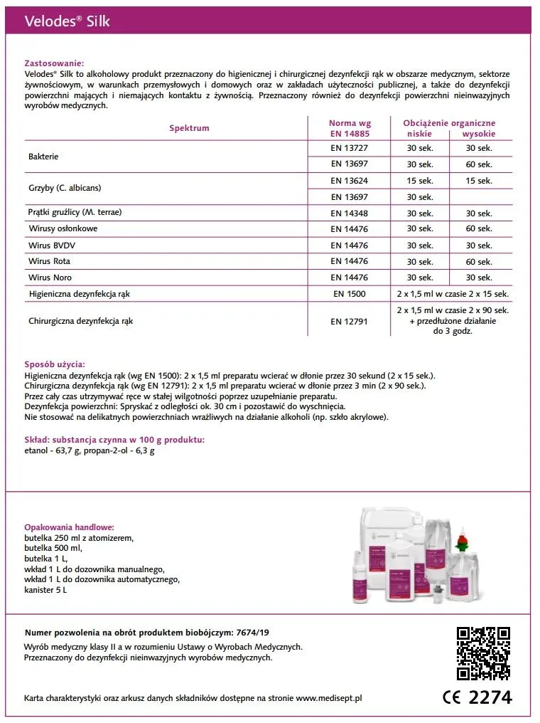 Zastosowanie: Velodes® Silk to alkoholowy, gotowy do użycia produkt przeznaczony do higienicznej i chirurgicznej dezynfekcji rąk w obszarze medycznym, sektorze żywnościowym, w warunkach przemysłowych i domowych oraz w zakładach użyteczności publicznej, a także do dezynfekcji powierzchni mających i niemających kontaktu z żywnością. Przeznaczony również do dezynfekcji powierzchni nieinwazyjnych wyrobów medycznych. Wykazuje działanie bakteriobójcze, bójcze wobec prątków gruźlicy, drożdżakobójcze i ograniczone wirusobójcze (wobec Rotawirusa, Norowirusa) oraz bójcze wobec wirusów osłonkowych (w tym Vaccinia, BVDV, HIV, HBV, HCV, COVID-19). Jako wyrób medyczny do stosowania przez profesjonalnego użytkownika. Postać płynna.