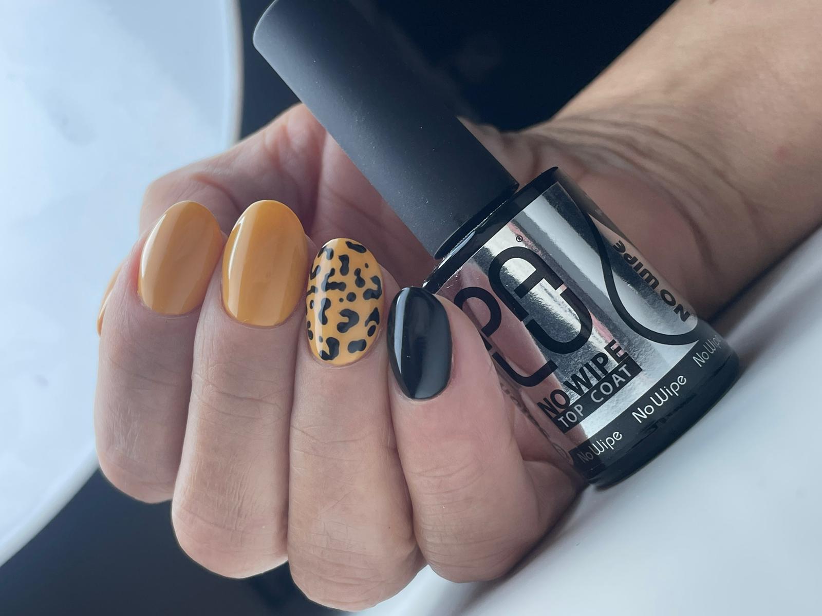 Delikatnie zmatowić płytkę paznokcia blokiem polerskim. Na odtłuszczoną CLEANEREM płytkę nałożyć jedną warstwę bazy i utwardzić w lampie UV/LED. Następnie na utwardzoną bazę nałożyć cienką warstwę kolorowego lakieru hybrydowego i utwardzić go w lampie UV/LED. W razie potrzeby czynność powtórzyć. Następnie nałożyć warstwę TOP COAT WIPE i utwardzić w lampie UV/LED.